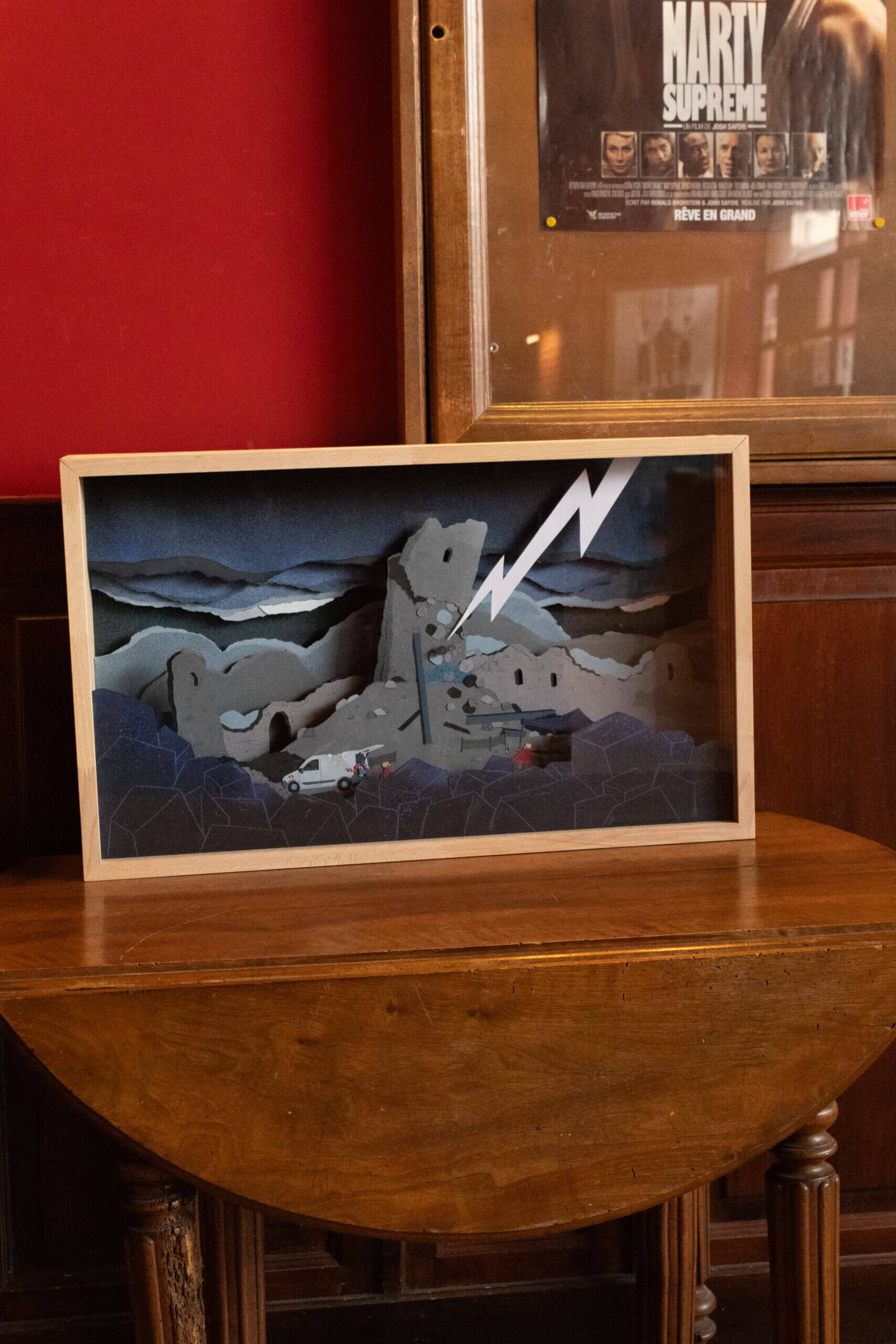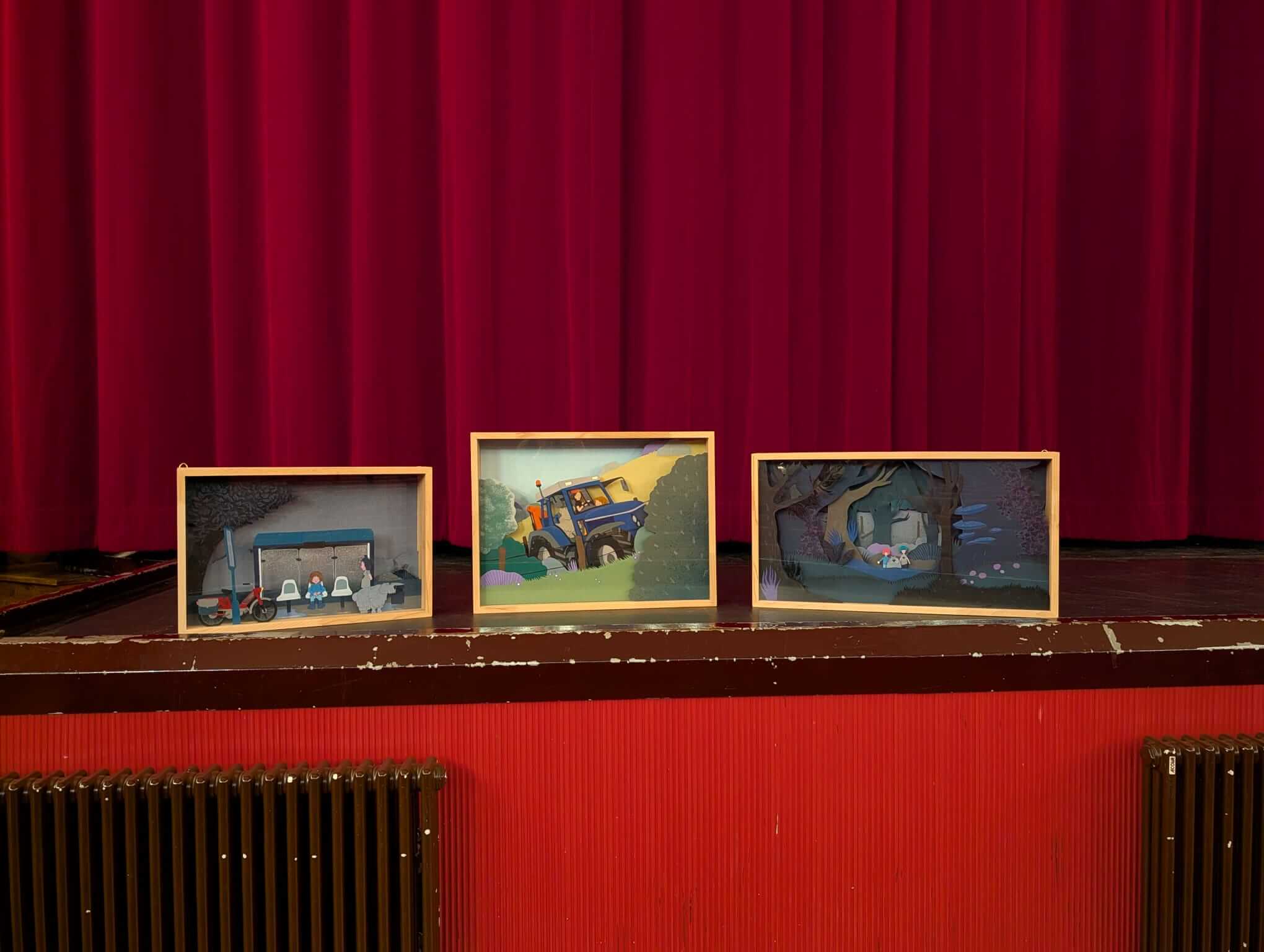Les cadres mettent en scène une sélection de plans du film, révélant la construction image par image des décors et des personnages. Dans chaque vitrine, les éléments originaux en papier découpé sont présentés sur cinq niveaux, faisant apparaître les différentes couches qui composent chaque scène.